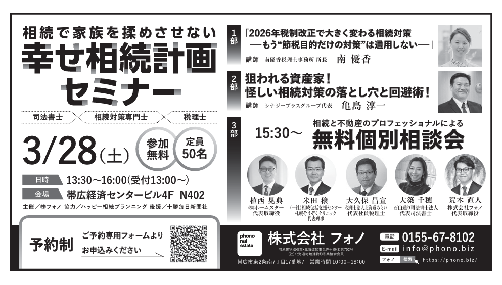 2026年3月28日(土)、帯広経済センタービルにて「幸せ相続計画セミナー」を開催。